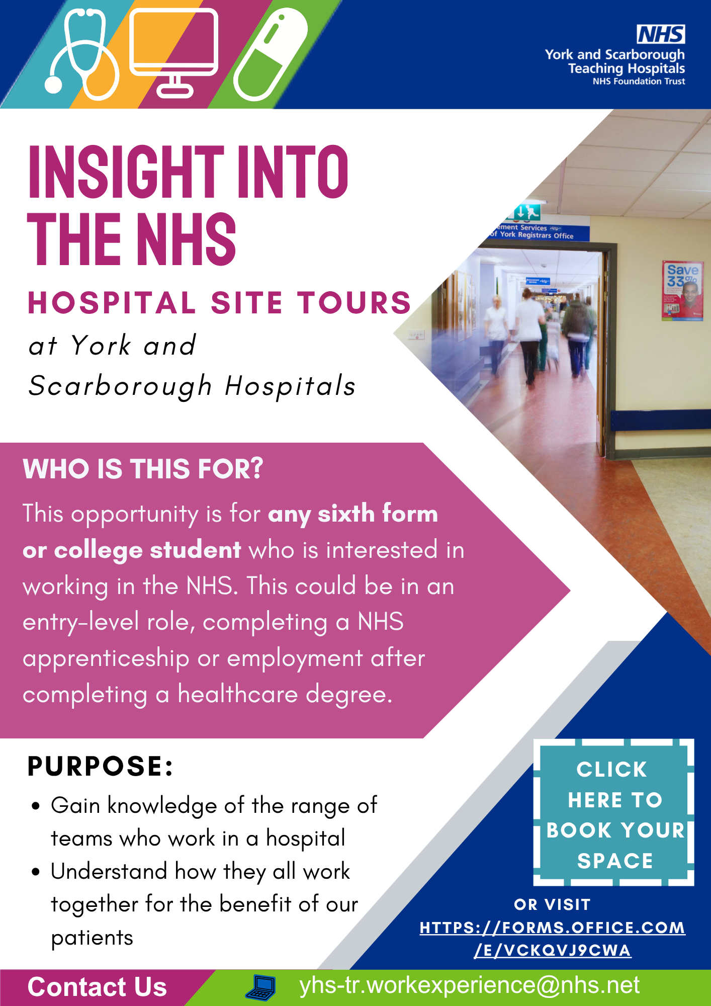 Note: The hyperlinks in the form are not active, so please follow this link to apply: Insight into the NHS - Site Tour Booking Form [York and Scarborough Teaching Hospitals]